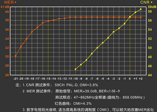 极高的接收灵敏度,Pin= -13dBm,,MER≥36.5dB